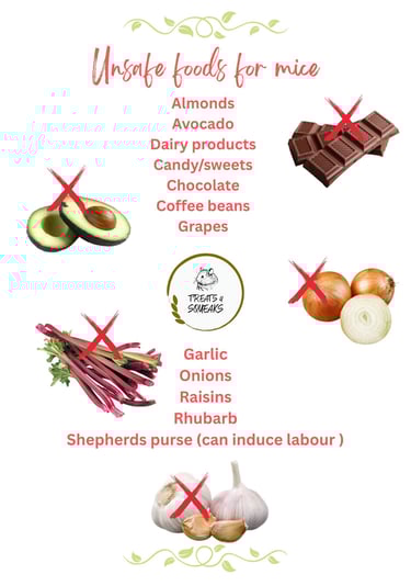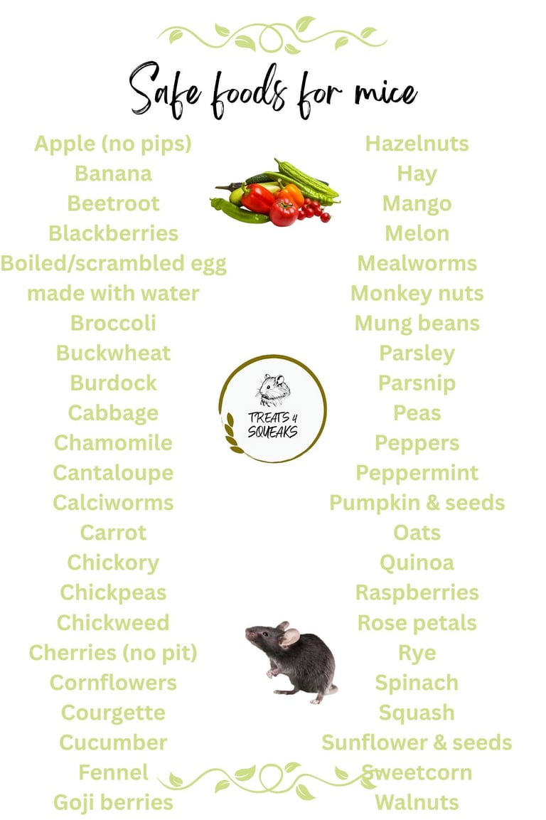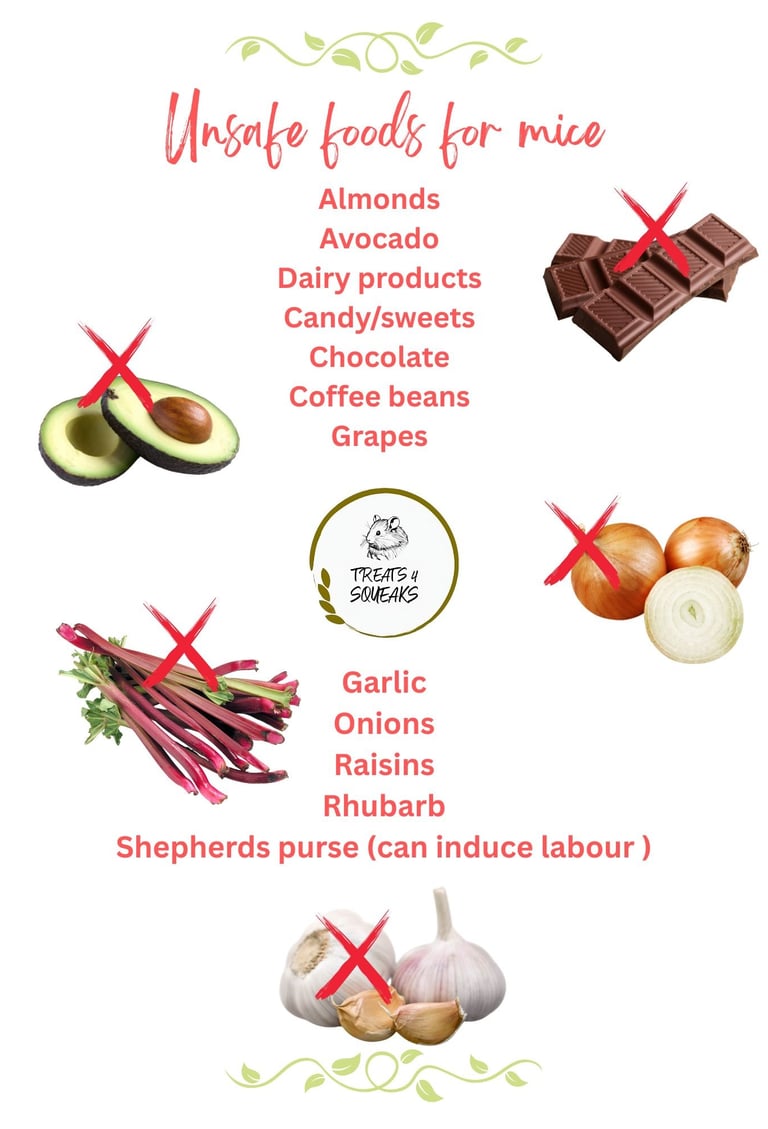When it comes to healthy food for pet mice, it is essential to include a range of natural items. Below are some infographics of safe & unsafe foods. Please note, mice are lactose intolerant. These natural food choices contribute to good health and well-being by ensuring your pet receives a balanced array of vitamins and minerals.
