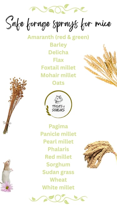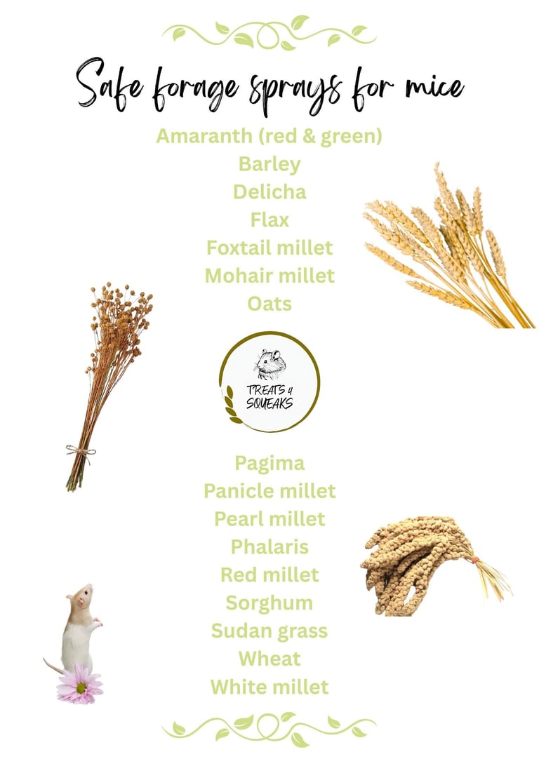Moreover, the act of foraging mimics their natural behaviour, providing both mental and physical stimulation and our forage sprays are great for this Enrichment forage bundle | Treats 4 Squeaks . It’s crucial to avoid processed foods and sugary treats that are detrimental to their health. Instead, focus on wholesome options that mirror their natural diet to support their overall well-being Healthy Treats for Pet Mice | Treats 4 Squeaks.